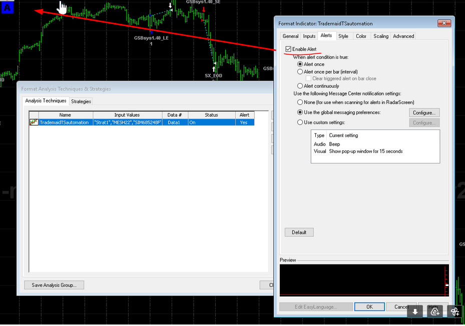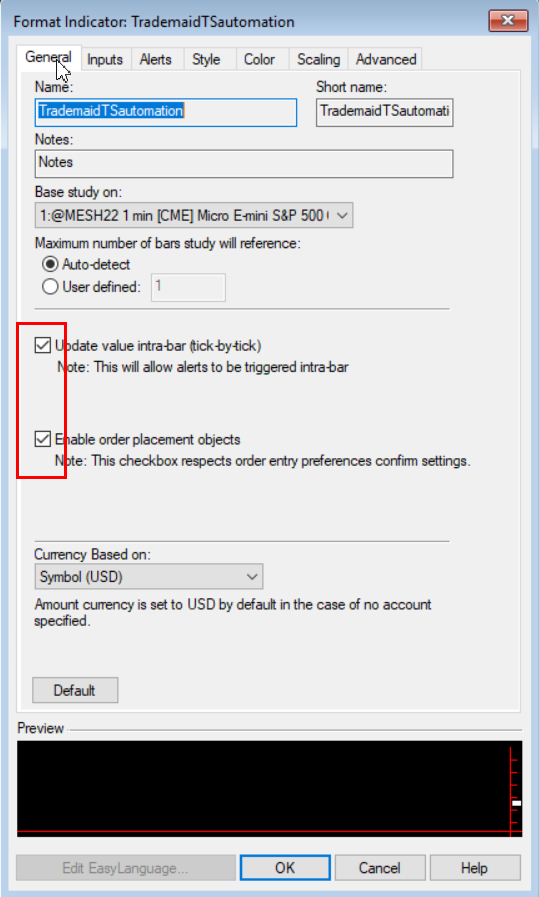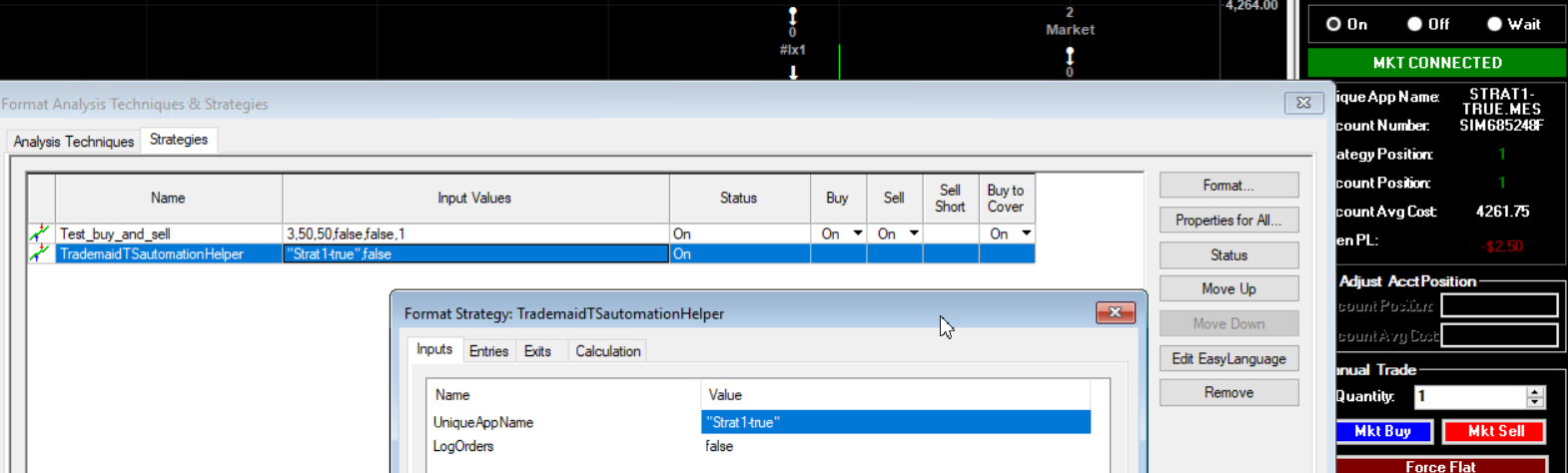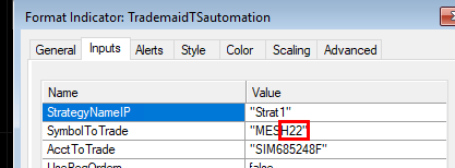 The system name on the helper must be the same as in the automation indicator which will match whats on the chart. Note however on the TM user interface, the symbol is also added at the end of the strategy name. Do NOT add the symbol name in the TrademaidTSAutomationHelper system name.
