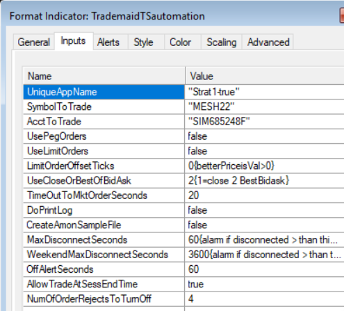 What is critical that every UniqueappName is unique for each chart. Clicking default will set the system name to strat1 every time you add the indicator to a chart, and you must make sure you always change this input to avoid duplicate strategy names.