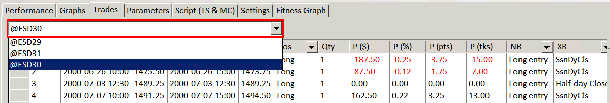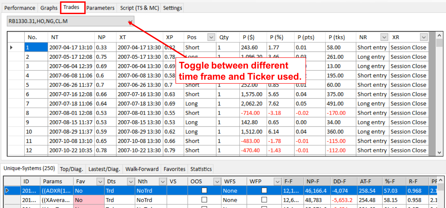 GSB top GUI tabs (Graphical user interface) Trades Trade All the trades on one individual System is shown in the Trade section. On the top you have option to see only trade from certain time frame or ticker you used for the test.