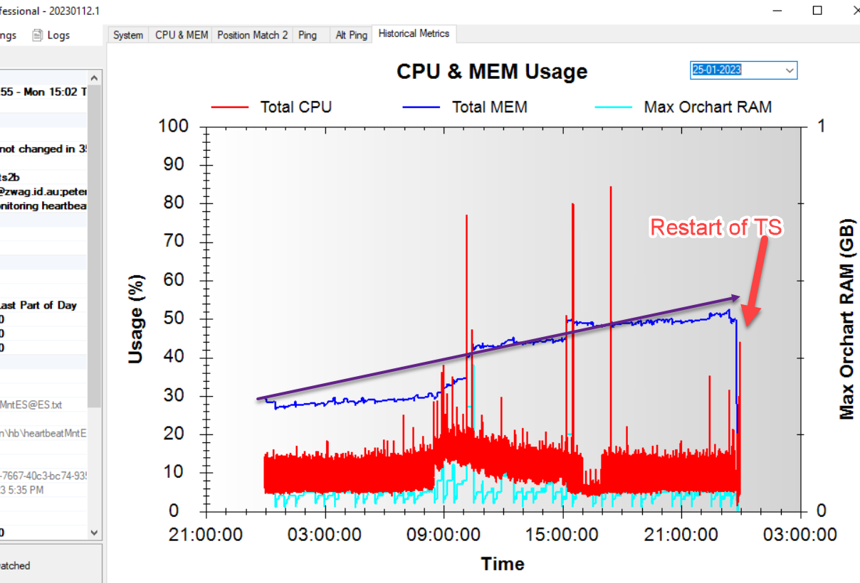The chart below is healthier, and the orchart level is lower and horizontal. A daily restart of TS does wonders for covering up this memory leak and improving TS stability. This machine has > 60 charts, is setup correctly, and TS is restarted every day.