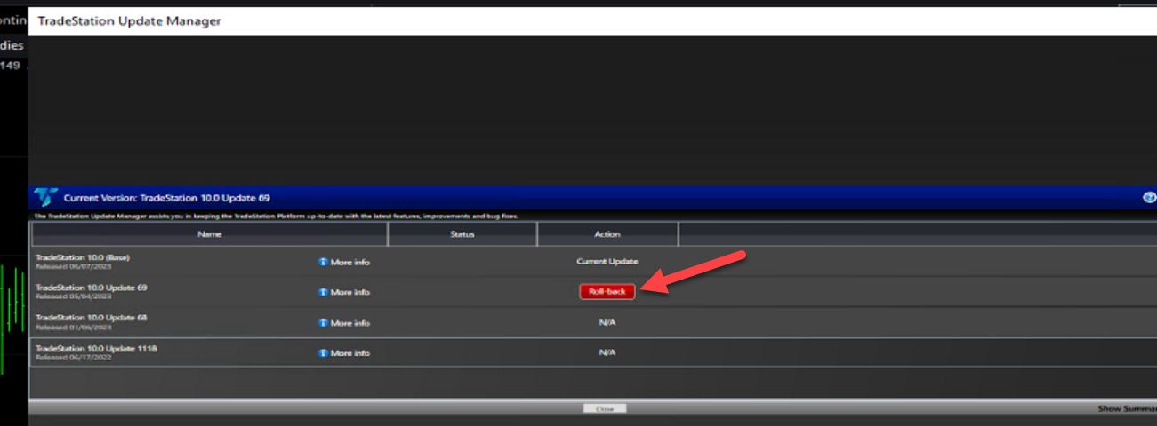 To rollback from build 69 to 68, click on rollback here under Ttradestation update manager