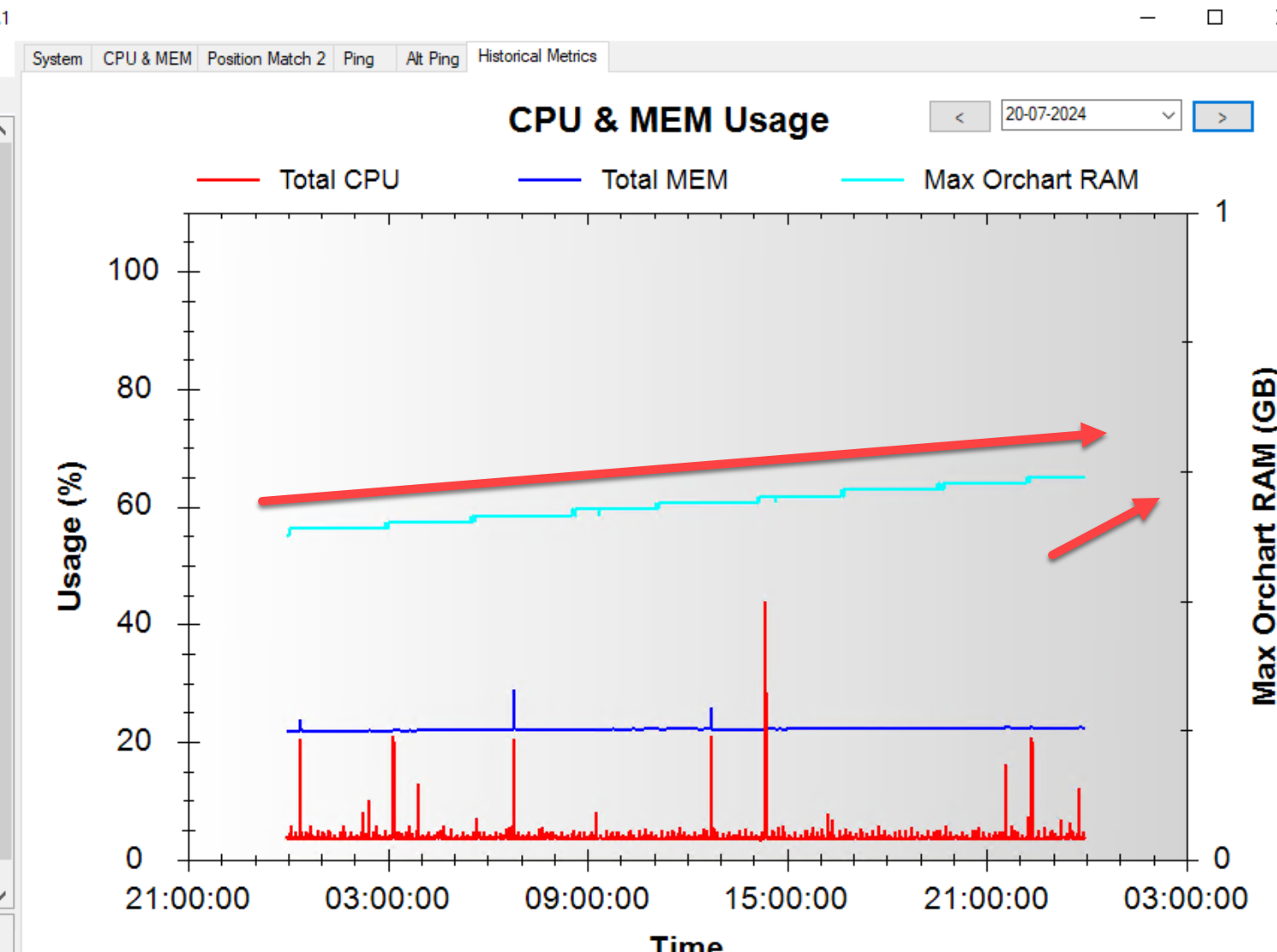 Note in the example, the cyan orchart.exe line is high, and constantly increasing. Soon in the example TS will crash. This VM has only 6 charts running, and the charts have NOT been correctly setup to use as few bars as possible. (see Only use 1 or 2 years of data per chart.) below