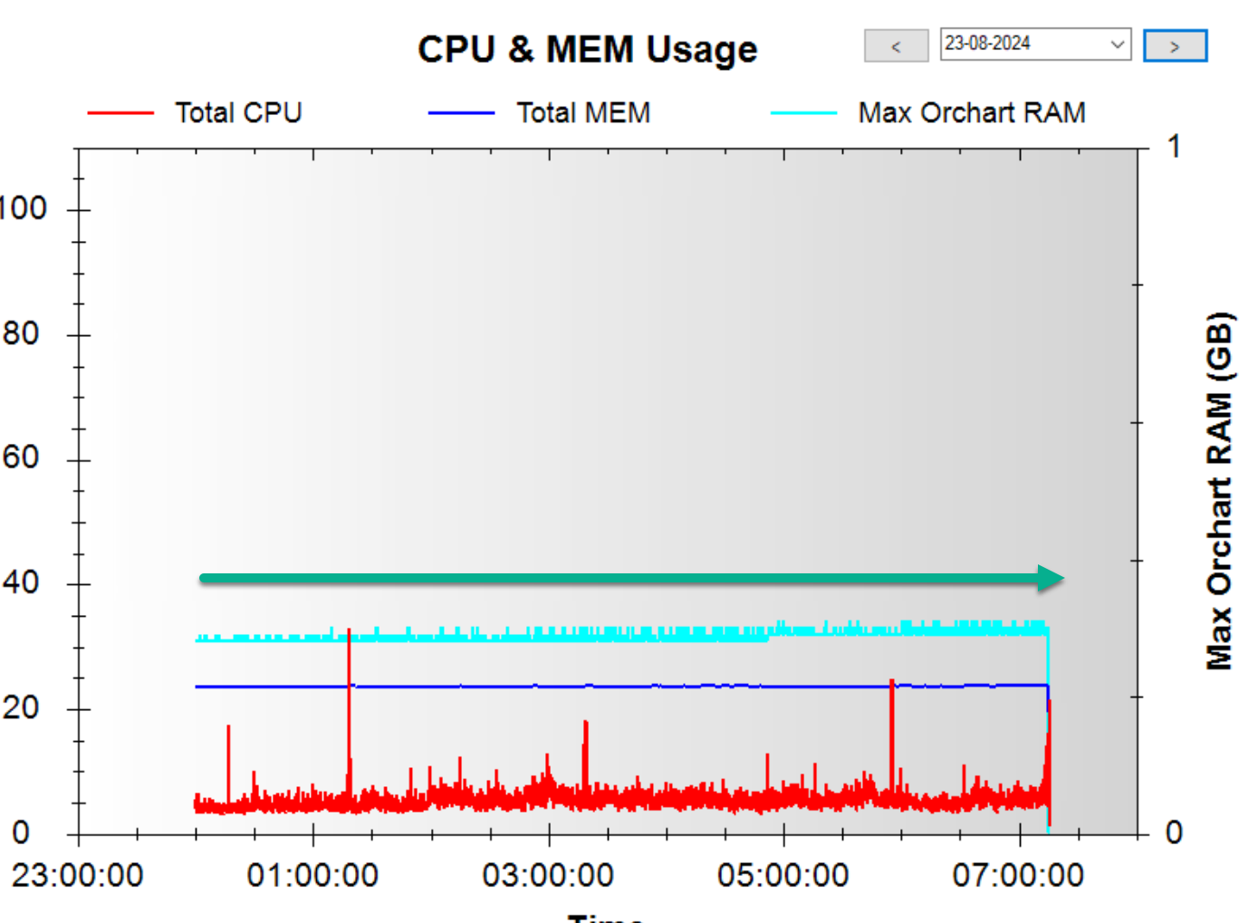 TS will crash when any orchart.exe gets a bit over 3GB in size or the machine runs out of ram. When the leak occurs memory usage increases dramatically.