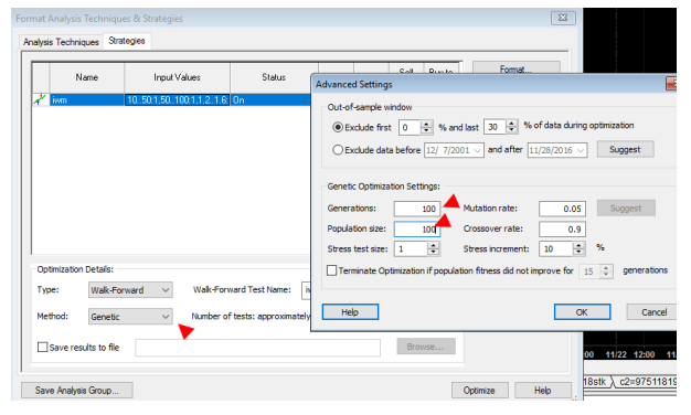Optionally change method from brute force to genetic. I prefer 10,000 iterations as a minimum, or using genetic - 10% of the iterations of brute force. Whatever number is larger. Normally I keep generations at 100. If optimization takes too long, you may have to lower the amount of iterations somewhat. Too few iterations will not give a robust Walk Forward.
