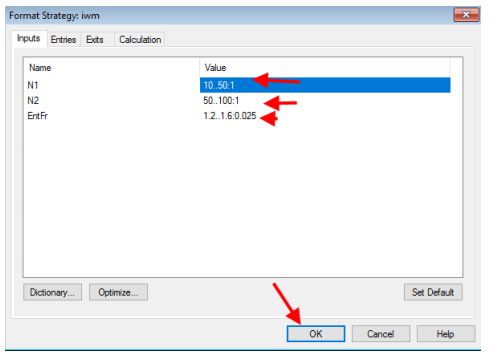 2. Format the strategy and set the optimization values for your strategy and click ok: