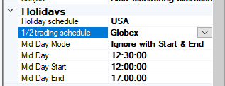There are 3 1/2 holidays per year on Globex where the market shuts at 12:30 central USA time. Normally day trading systems are turned off on these days, so alarms also should be turned off.