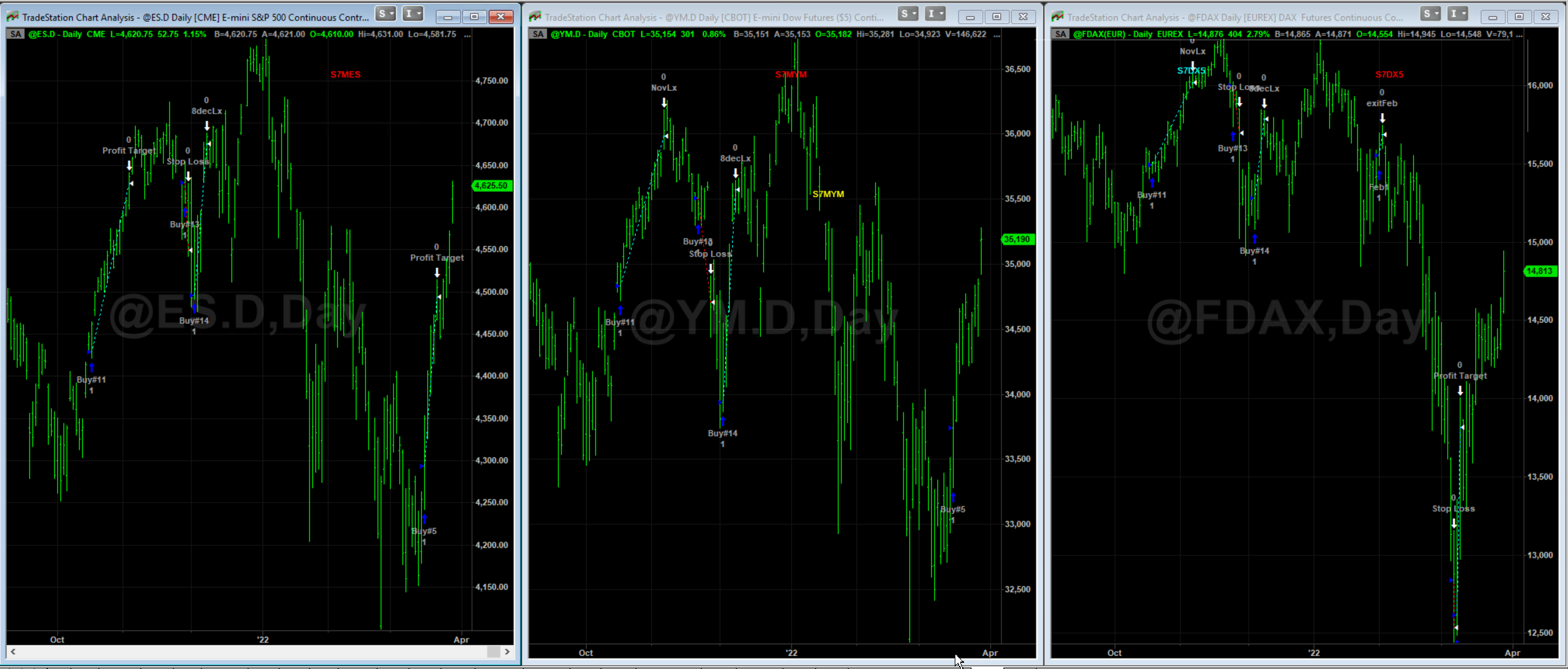 YM and Dax markets are all out of sample. Identical parameters for all markets, except stop and profit targets.