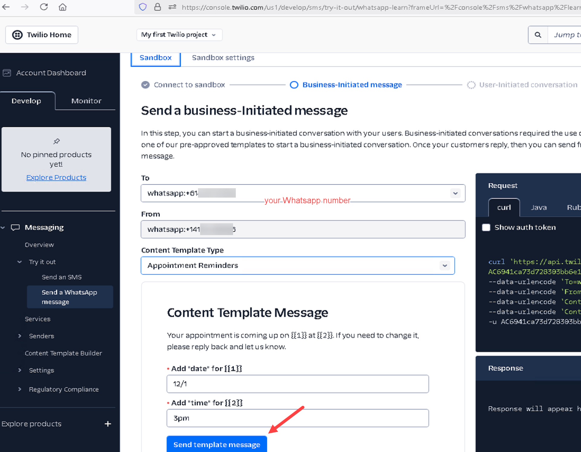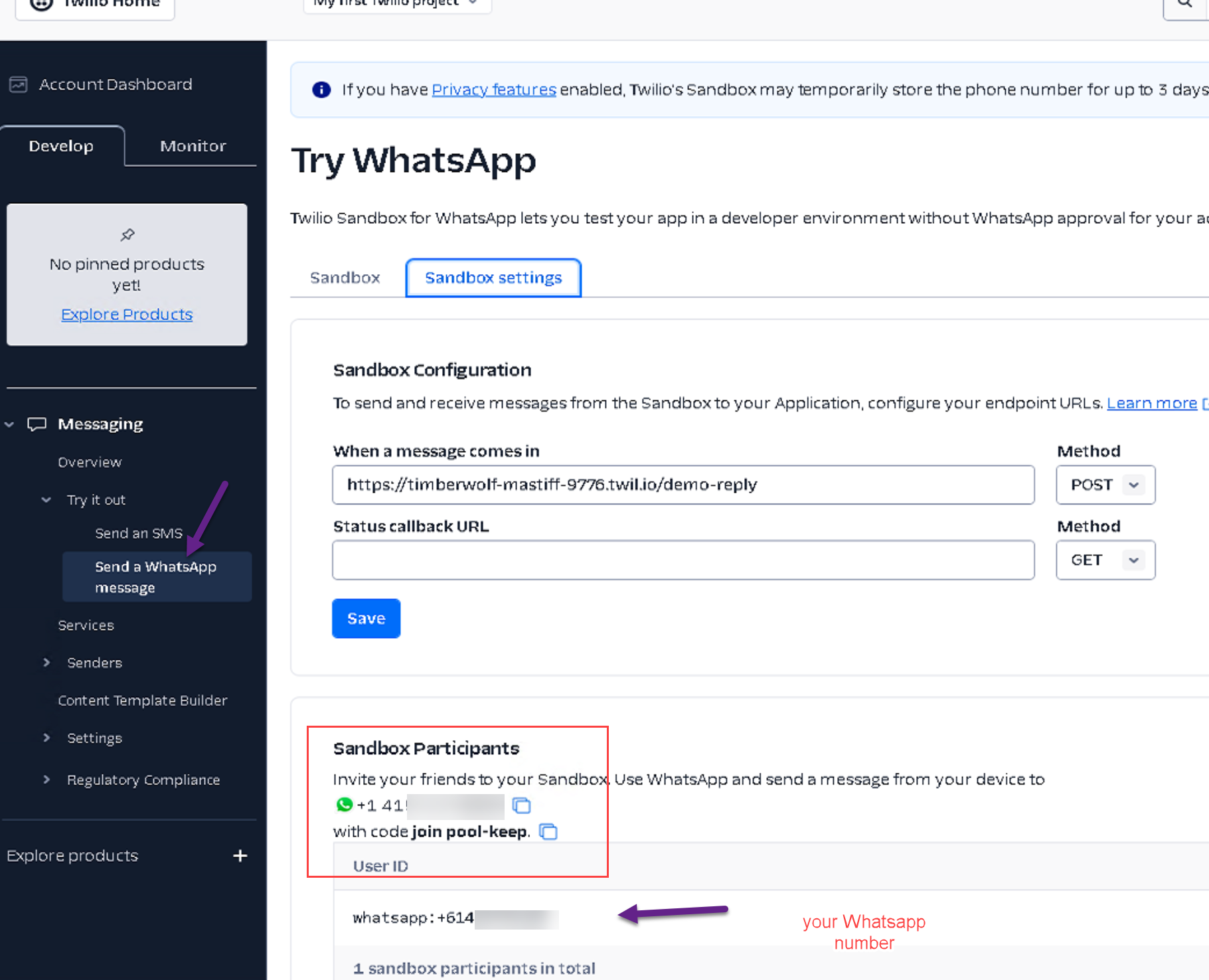 1) Send a message of join pool-keep to the tel number in sandbox participants.