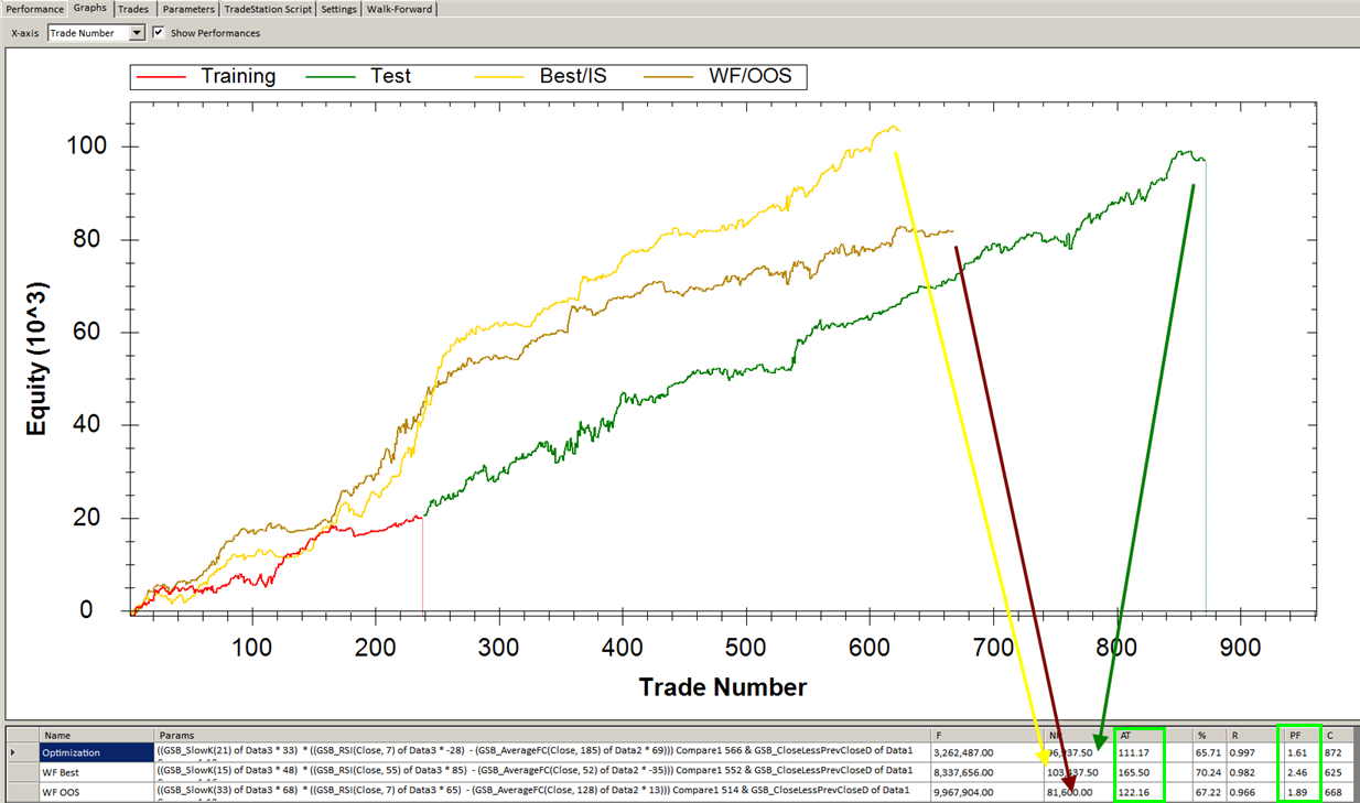 An acceptable result is shown below. Note how the Average trade and profit factor have increased in the IS and OOS curve. This is somewhat at the expenses of net profit and number of trades. This is still very acceptable. Different fitness specs will vary these results a fair bit. If an identical second WF gives fairly different results, you need to have more iterations done. (increase WF Generations / population)